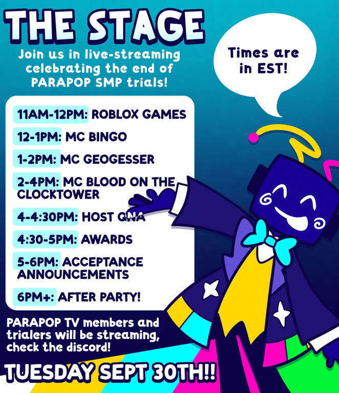 🎊Parapop SMP's trials are about to end!!To celebrate the end of trials, on September 30, we'll be livestreaming leading up to announcing the accepted members!Check our discord for who's streaming and tune in! 🎉